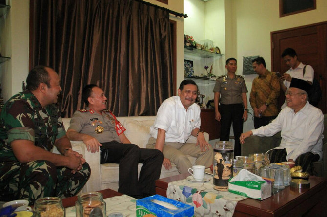 Menitone.com – Menteri Kemaritiman Luhut Binsar Pandjaitan, Kapolda Metro Jaya Irjen Pol M Iriawan, Pangdam Jaya Mayjen TNI Tedy Laksmana, dan sejumlah perwira penengah Polri menyambangi kediaman Ketua Majelis Ulama Indonesia (MUI) Ma’ruf Amin, di Jalan Deli Lorong 27 Koja, Tanjung Priok, Jakarta Utara, Rabu (1/2) malam.