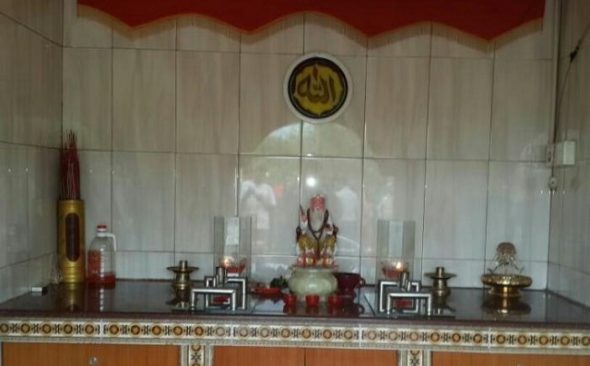 Dimana dalam penjelasan paranormal tentang tempat yang dianggapnya keramat tersebut ada Muslim dan Kong Hu Cu. Sehingga selaku pengelola berinisiatif memasang lafaz Allah dinding termasuk tasbih dikalungkan ke patung.